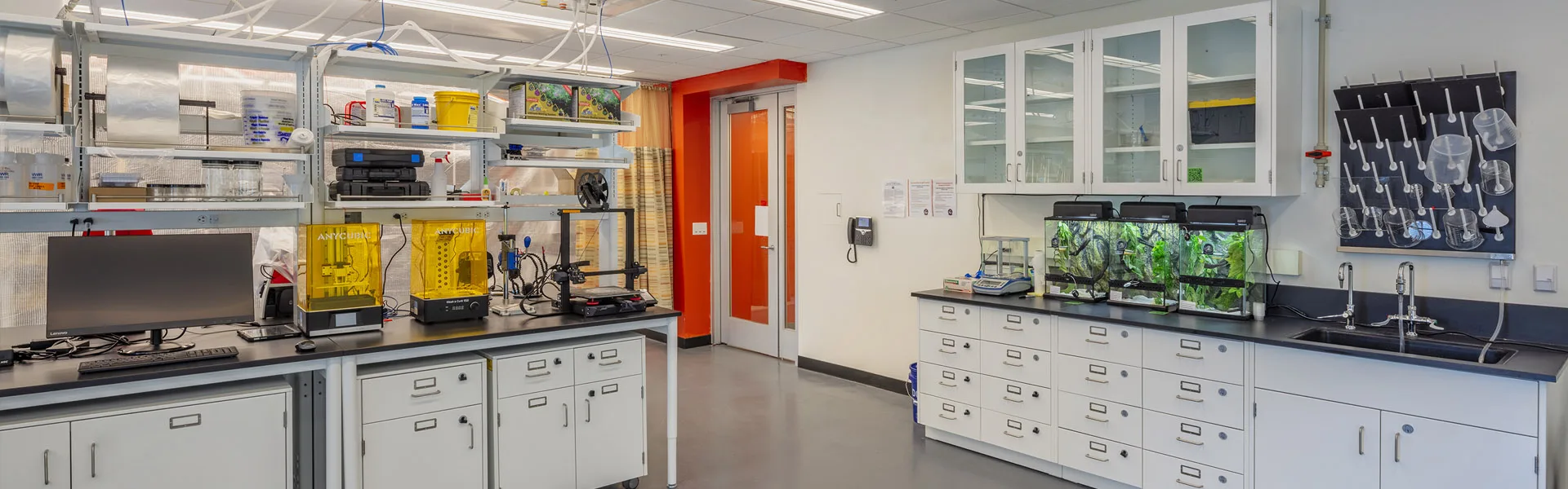 This renovation covered multiple areas of the CST. Roughly 10,000 SF of labs in the west wing were outfitted with high-end mobile benches, casework, fume hoods and a ceiling panel system. Above the ceiling, new connections and mechanical equipment provide HVAC services and access to lab gas, purified water and other resources. Two smaller lab areas were also added in the basement. In the east wing, about 7,000 SF of renovated space provides the Chemistry Department with a large seminar room and a “theory room” for collaboration and informal meetings. Both rooms feature an aluminum/glass storefront, a new kitchenette and finishes. The 15,000-SF mechanical penthouse was gutted and outfitted with seven high-efficiency air handling units and six new rooftop exhaust fans that pull lab/chemical air from the building. An aluminum screen wall hides the fans while reducing noise from their operation.